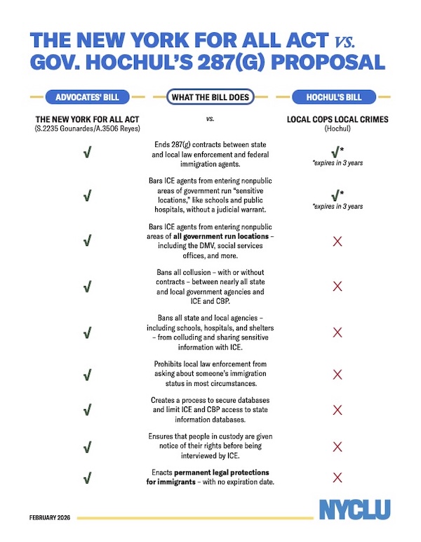 In New York, there are two legislative solutions that would  allow our state to stand up for immigrants: Governor  Hochul’s Local Cops, Local Crimes Bill and the New York  for All Act (S2235/A3506).