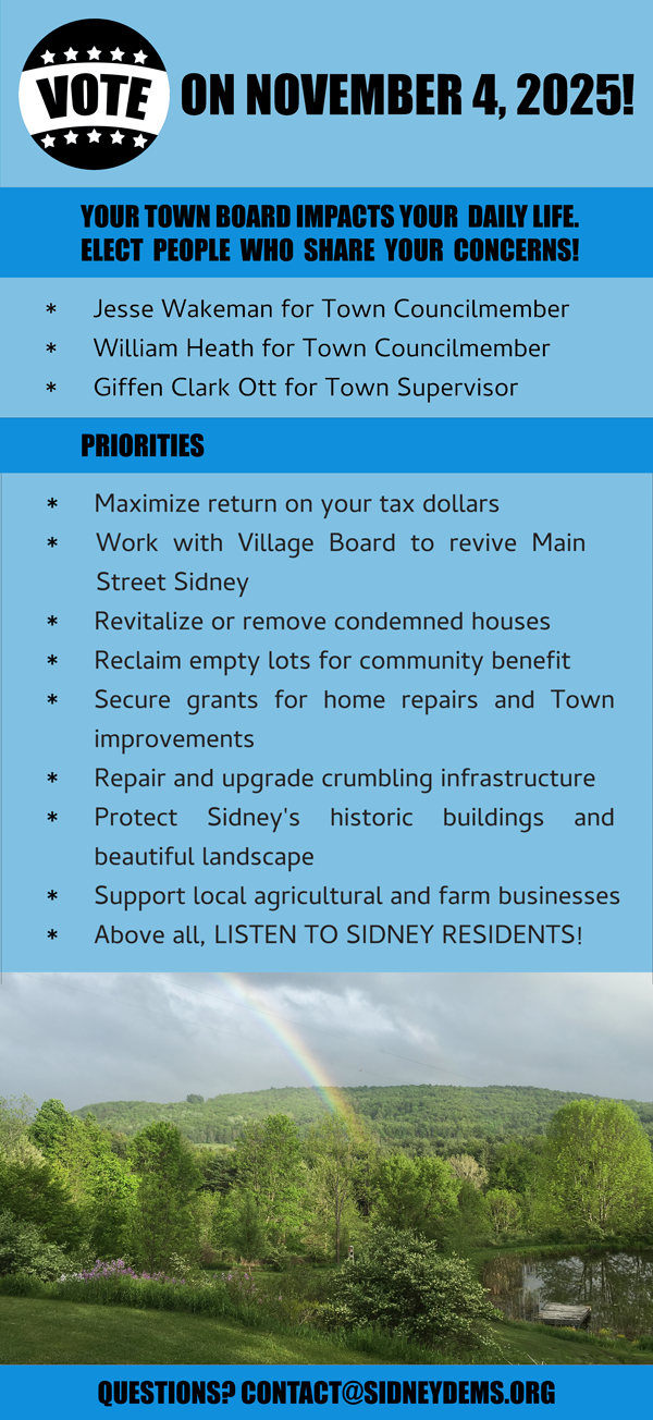 Your resource for Sidney offices on the ballot, candidates, county elected Democratic officials, and committee members.